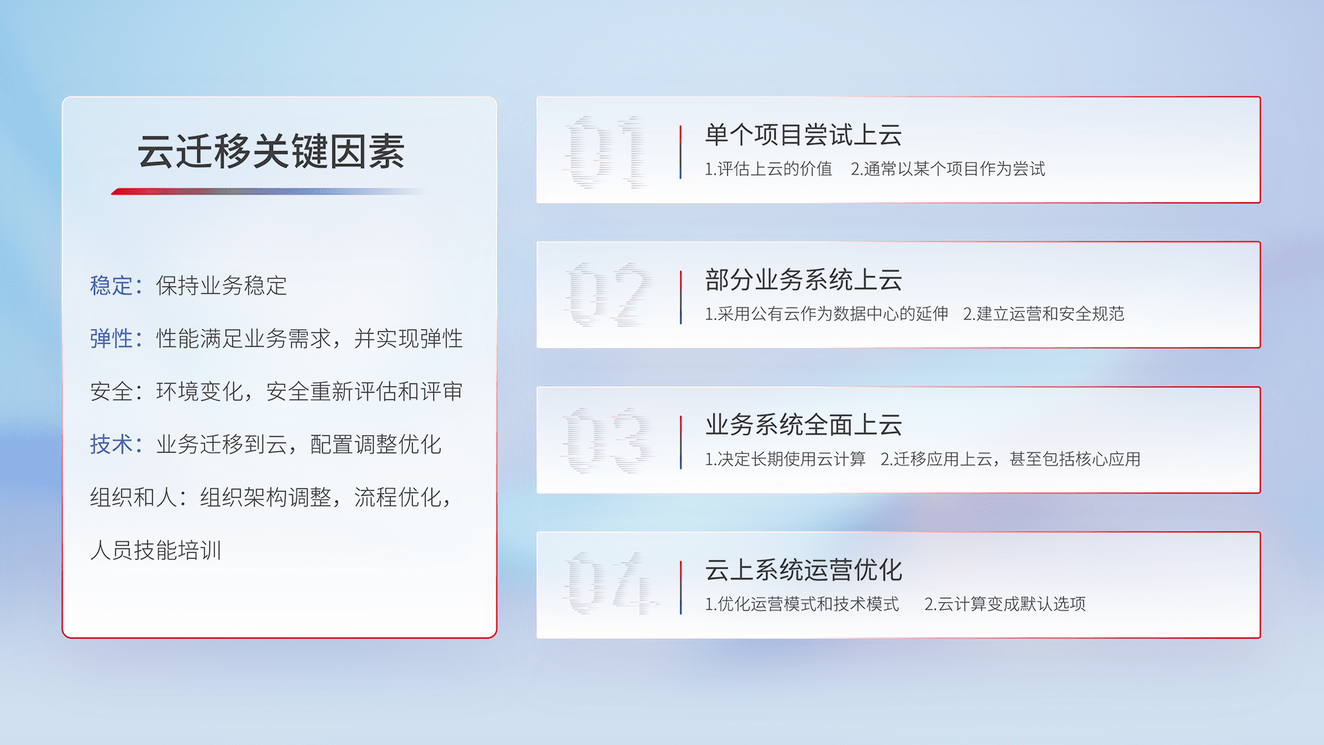 结合实际业务,,,从规划设计、、云平台选型、、云原生改造、、、数据迁移、、集成交付,,迁移全过程为客户识别最佳上云路径,,做好风险识别管理,,设计网络架构、、、身份权限、、、、安全审计合规、、、、操作审计、、日志审计、、、监控告警策略、、、多站点容灾设计等,,,,对云上基础设施进行整体规划,,提升IT治理水平,,以满足弹性、、高可用、、高性能的需求。。