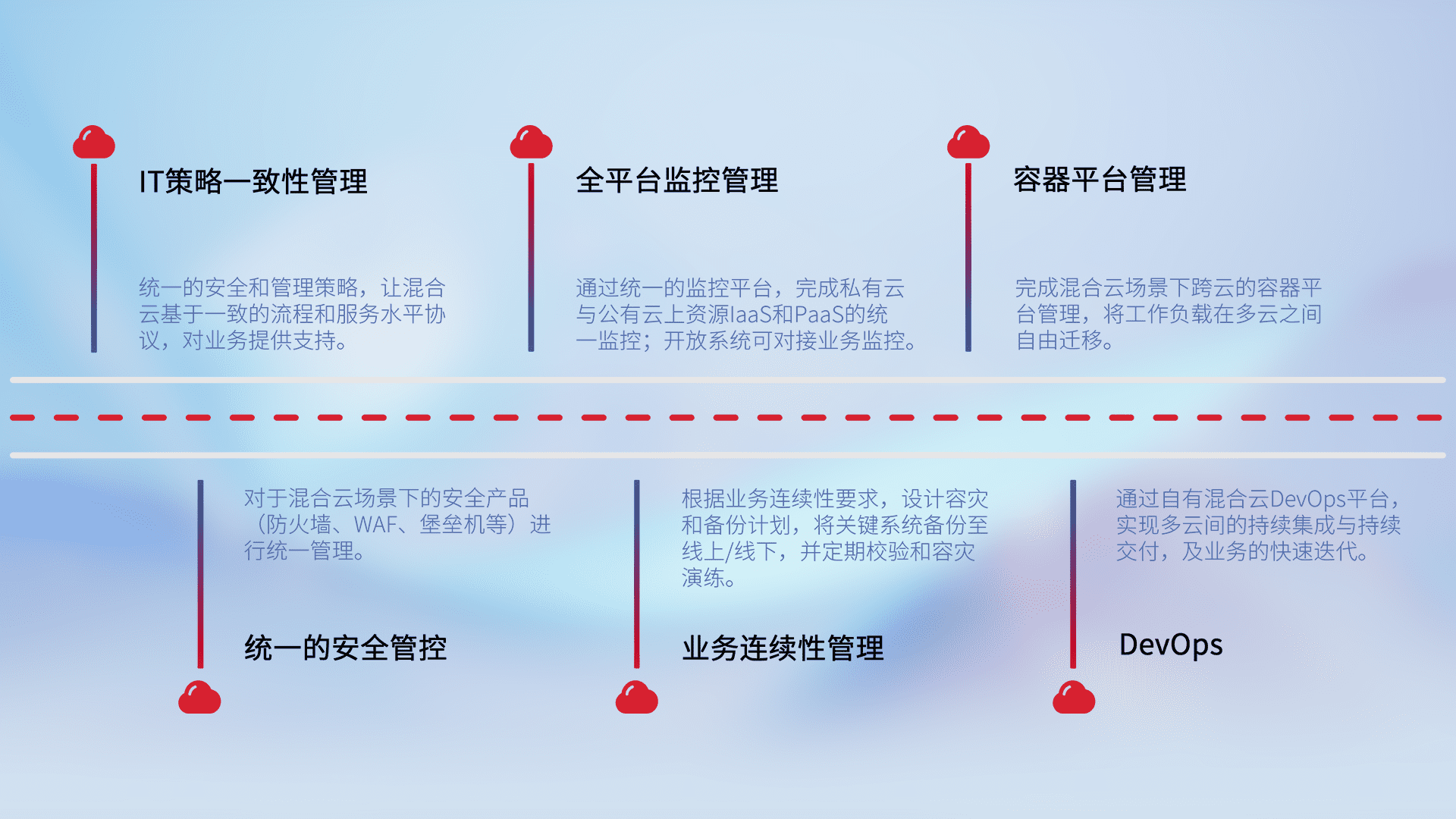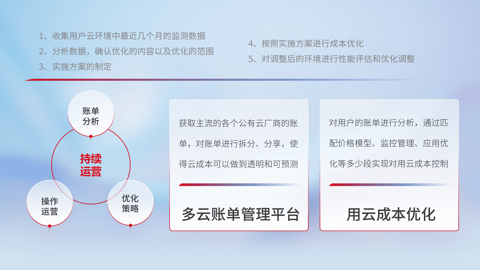 通过多云纳管,,以统一的资源数据模型把客户的云资源进行抽象和封装,,进而实现对多云资源的统一操作,,,保障云资源管理的可靠性、、稳定性与可用性。。。量身定制化运维内容,,,配置、、开发运维、、、、补丁管理、、、备份、、、、监控、、、、认证和访问管理、、审计和日常巡检等,,,,保障在用云过程中的可靠度,,,,稳定度以及高可用率。。