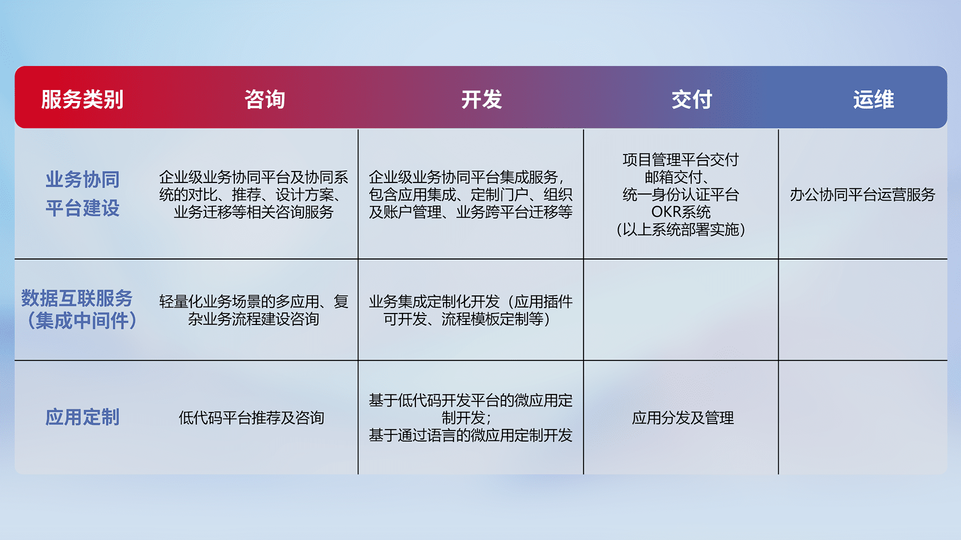 针对钉钉、、企微、、、IDaas等平台级产品提供产品的规划、、、、方案、、、交付、、、、定制化开发等服务,,,,实现如统一协同办公、、、、智能客户服务、、、混合会议管理、、智能数据查询、、等业务场景,,实现数字化转型。。